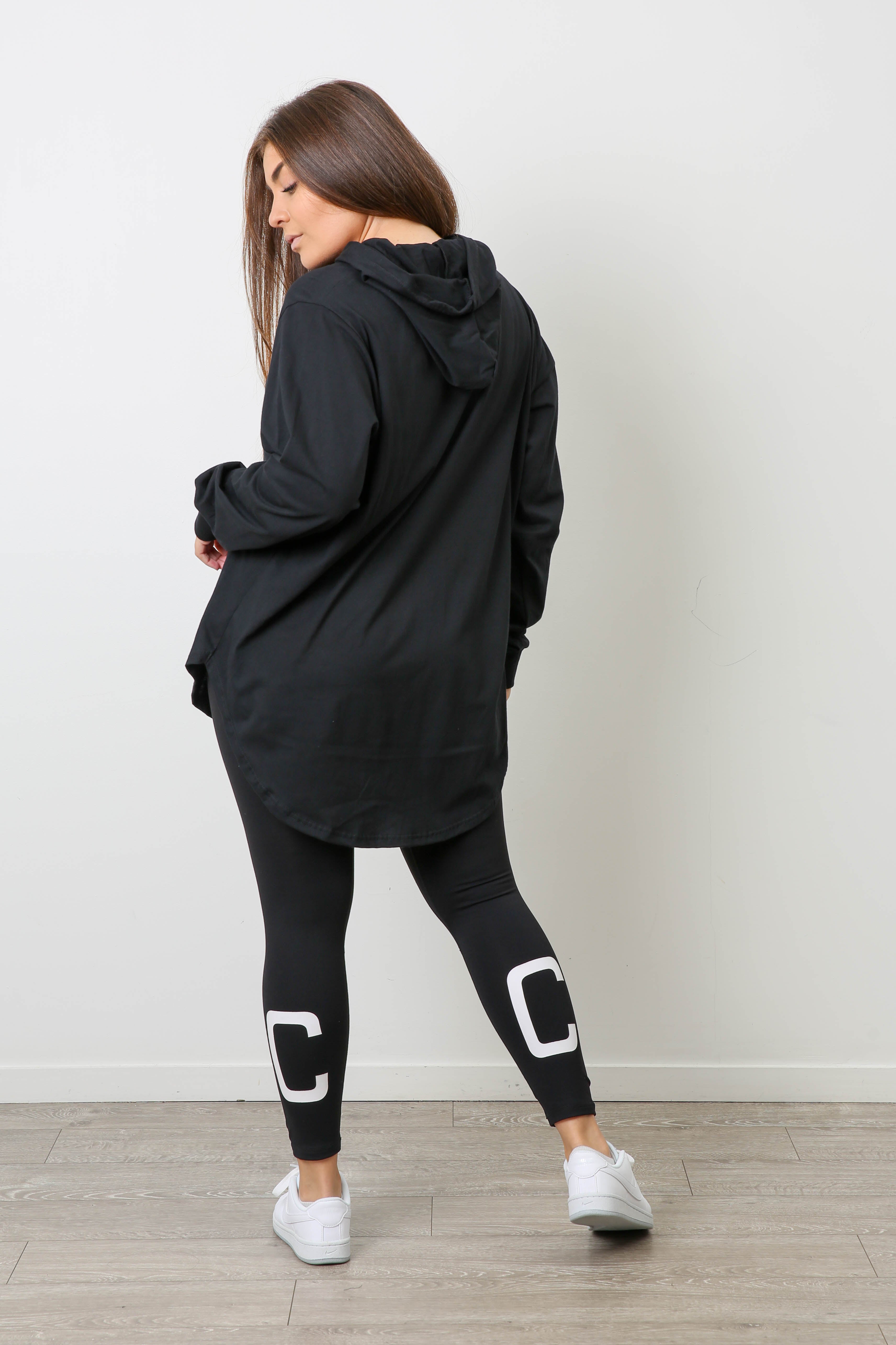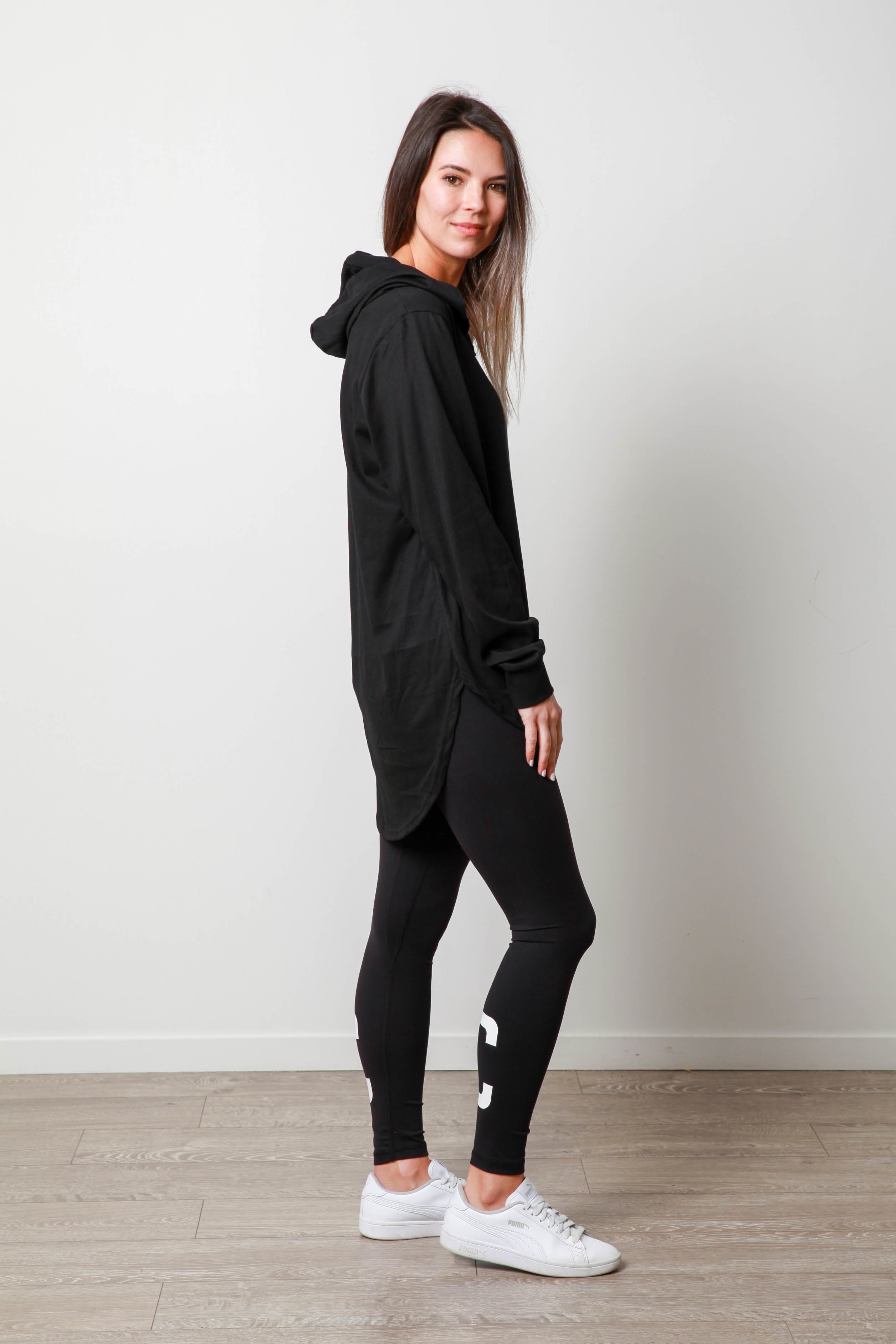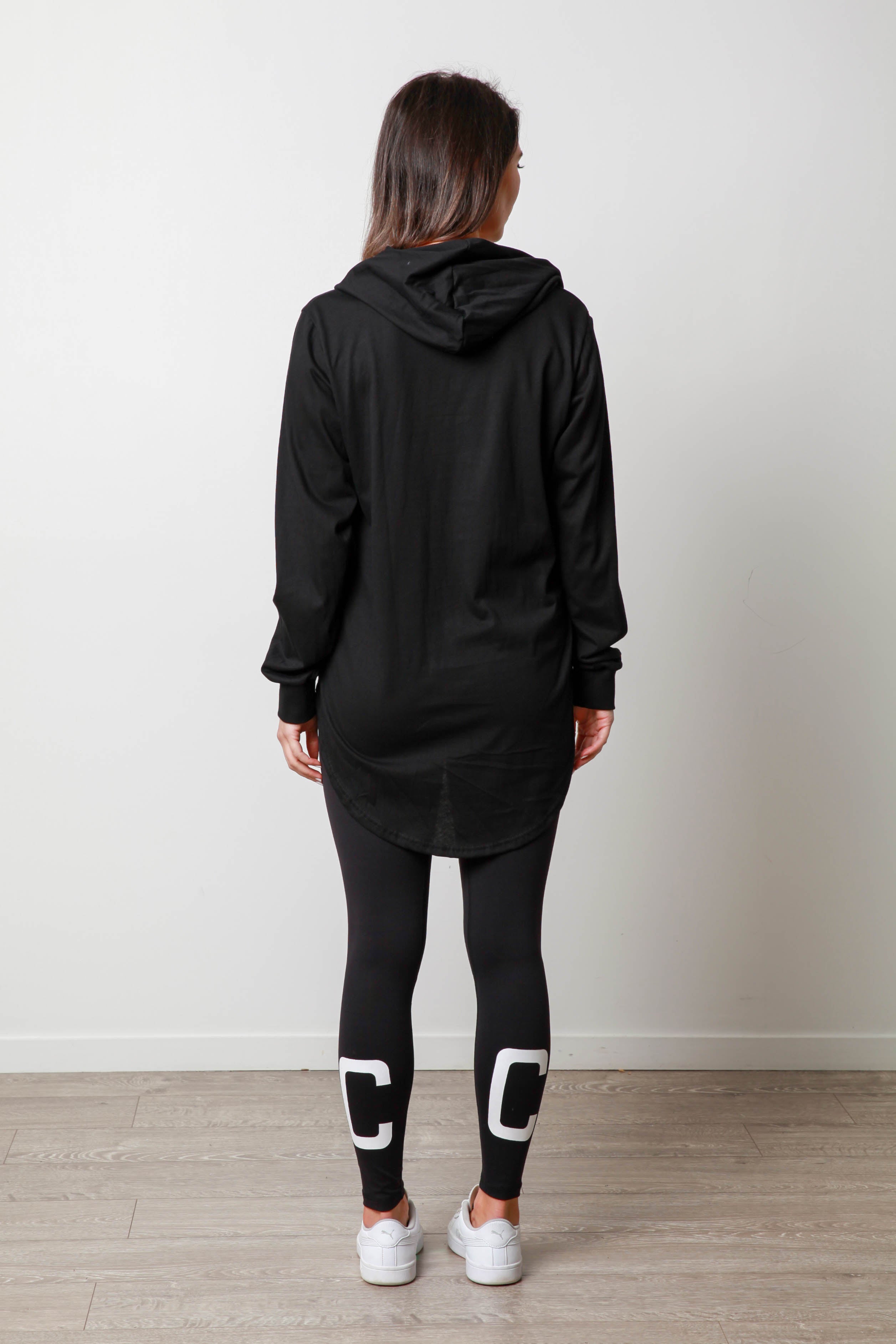 The perfect lightweight fabric for when you need that extra layer, and the curved hem looks great styled underneath a jacket and paired with a pair of leggings or trackies.Its soft material gives comfort and breathability. Details:- No pockets- Hood- Curved hemline- Light weight t-shirt material- Black Chinga patch