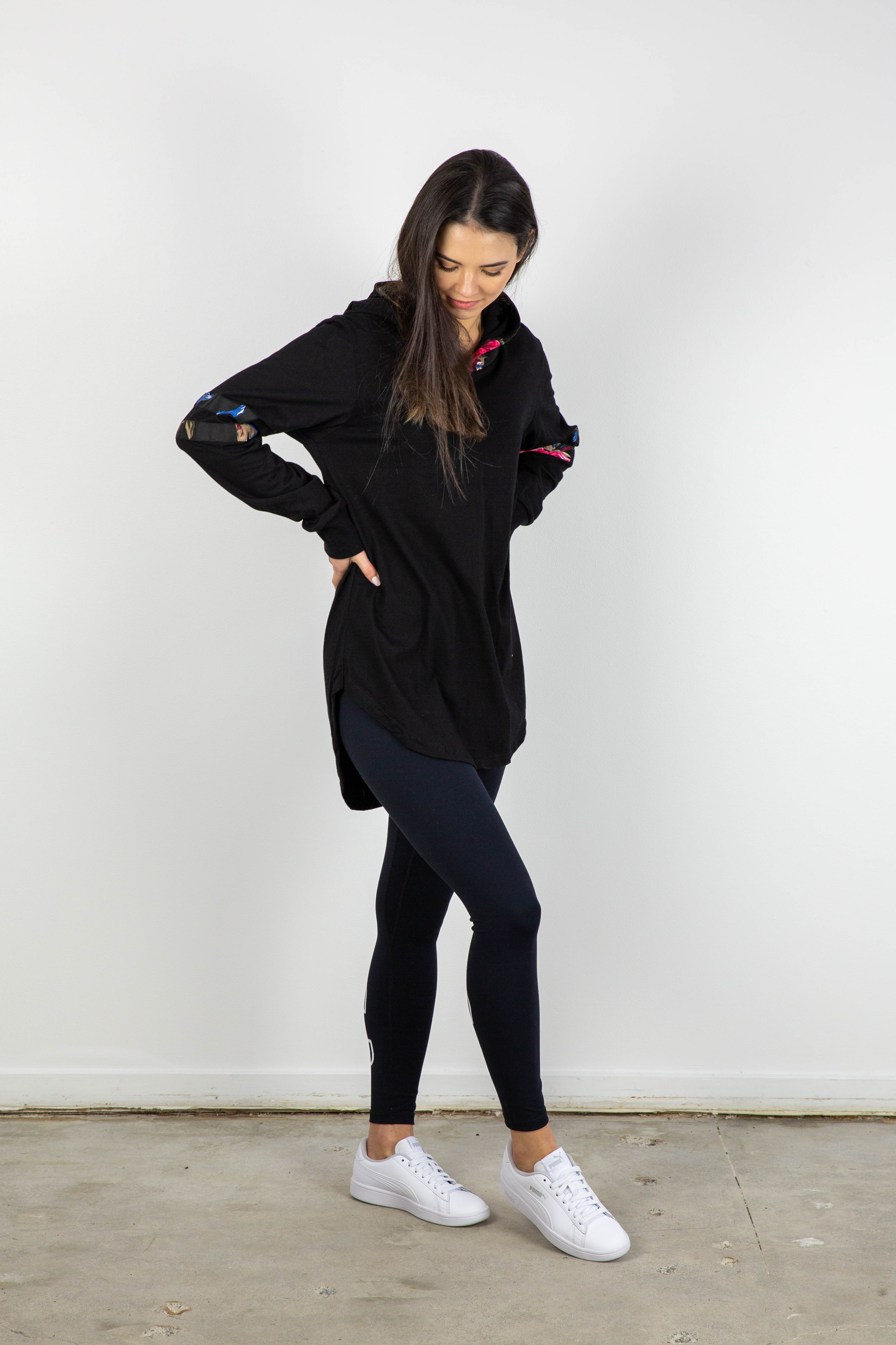 Details:- No pockets- Hood- Curved hemline- Longer length at the back- Floral detailing down the back and on the sleeves- Light weight t-shirt material- Material: Cotton/Polyester/Spandex