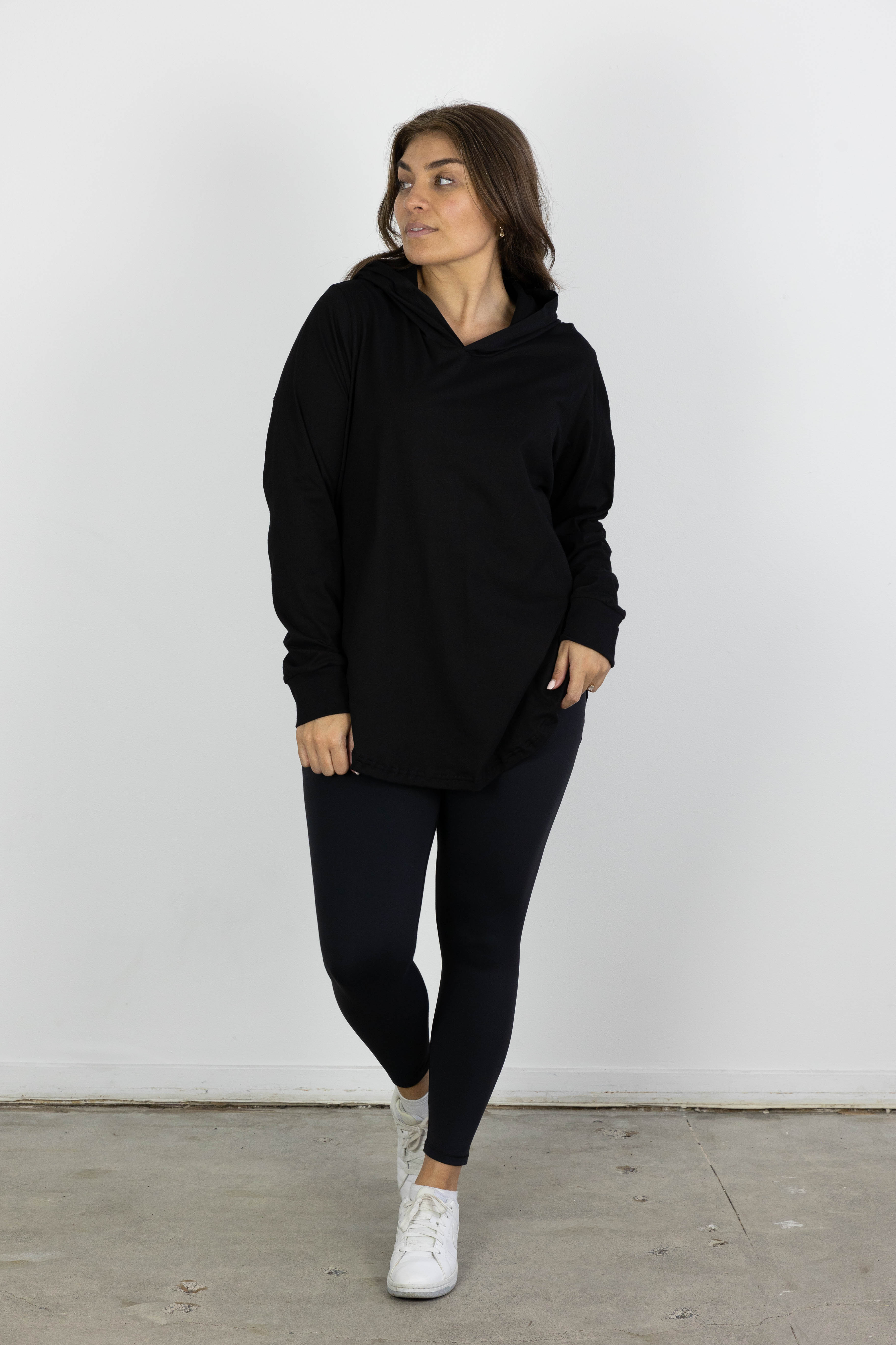 A classic lightweight long sleeve tee that is always handy to have in your wardrobe! It is the perfect lightweight fabric for when you need that extra layer, and the curved hem looks great styled underneath a jacket and paired with a pair of leggings.Details:- Black long sleeve with purple print- No pockets- Hood- Curved hemline- Light weight t-shirt material- Material: Cotton