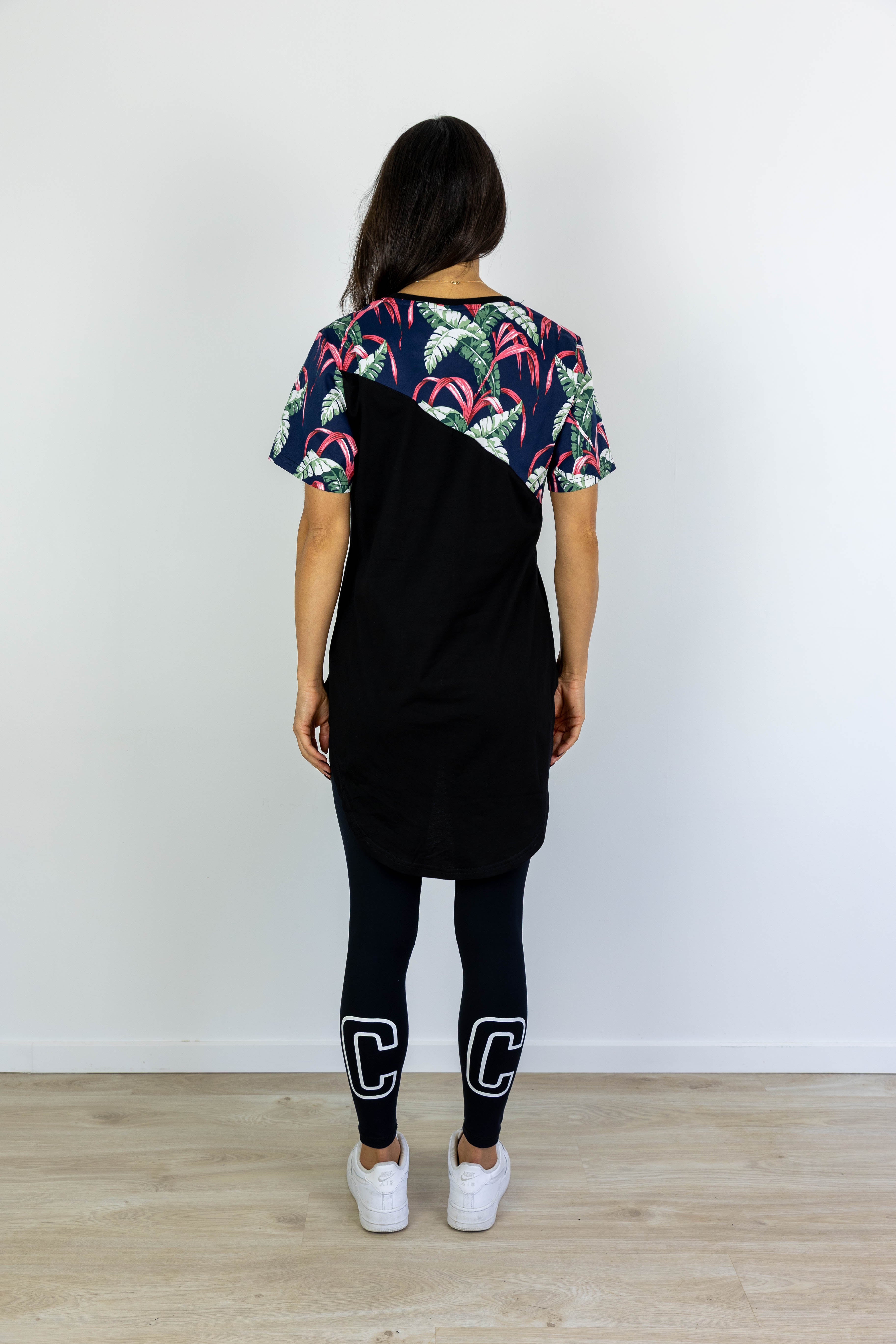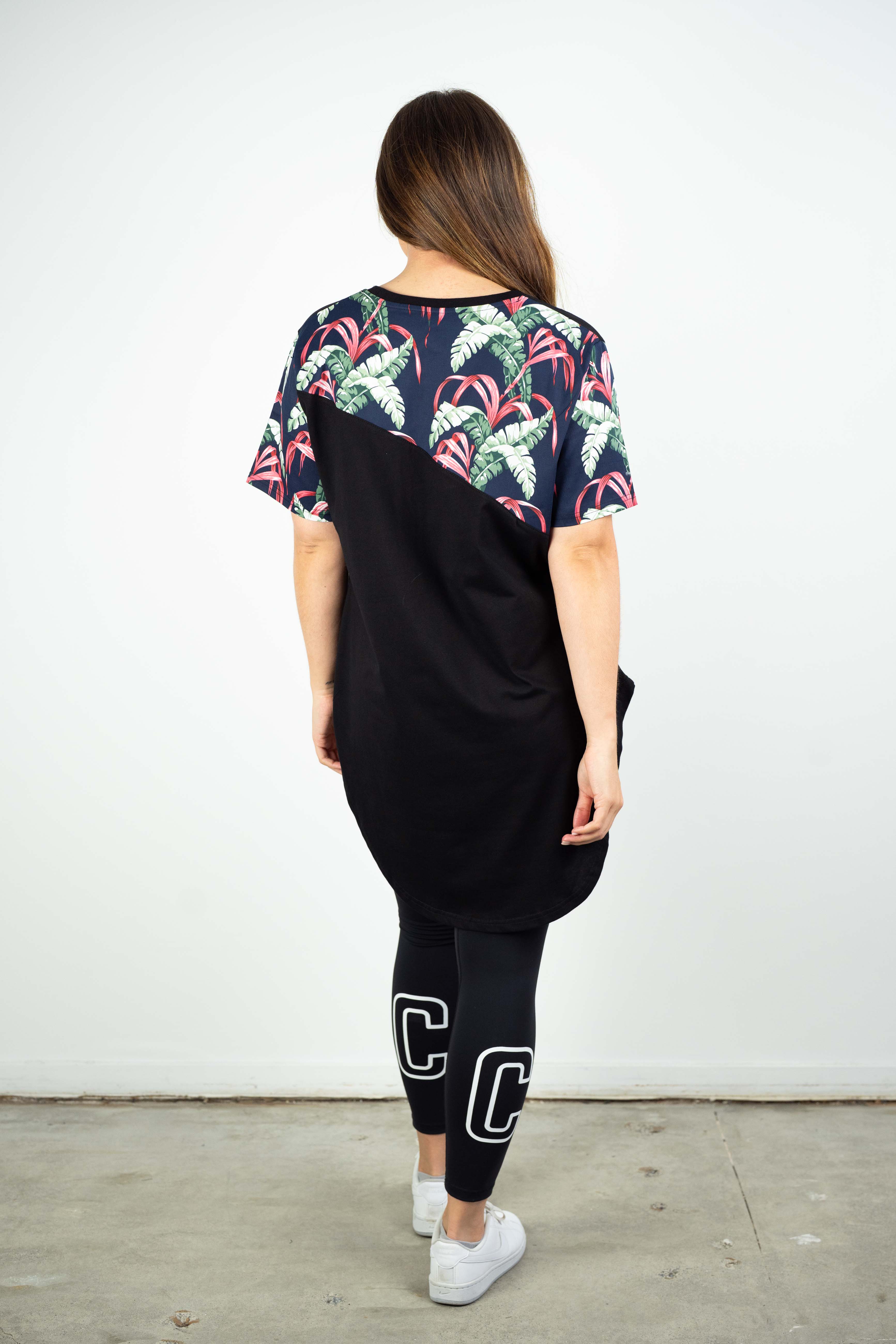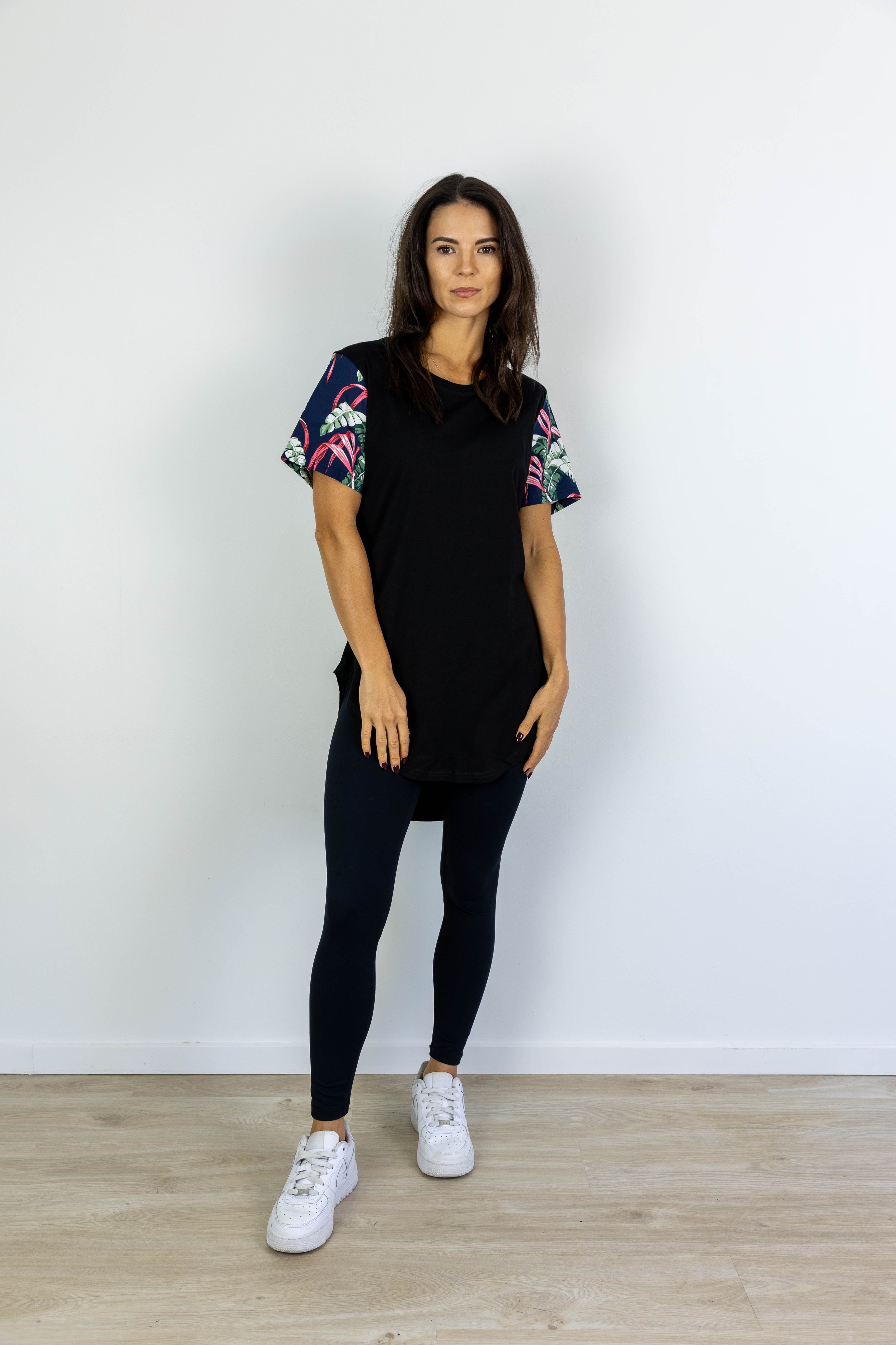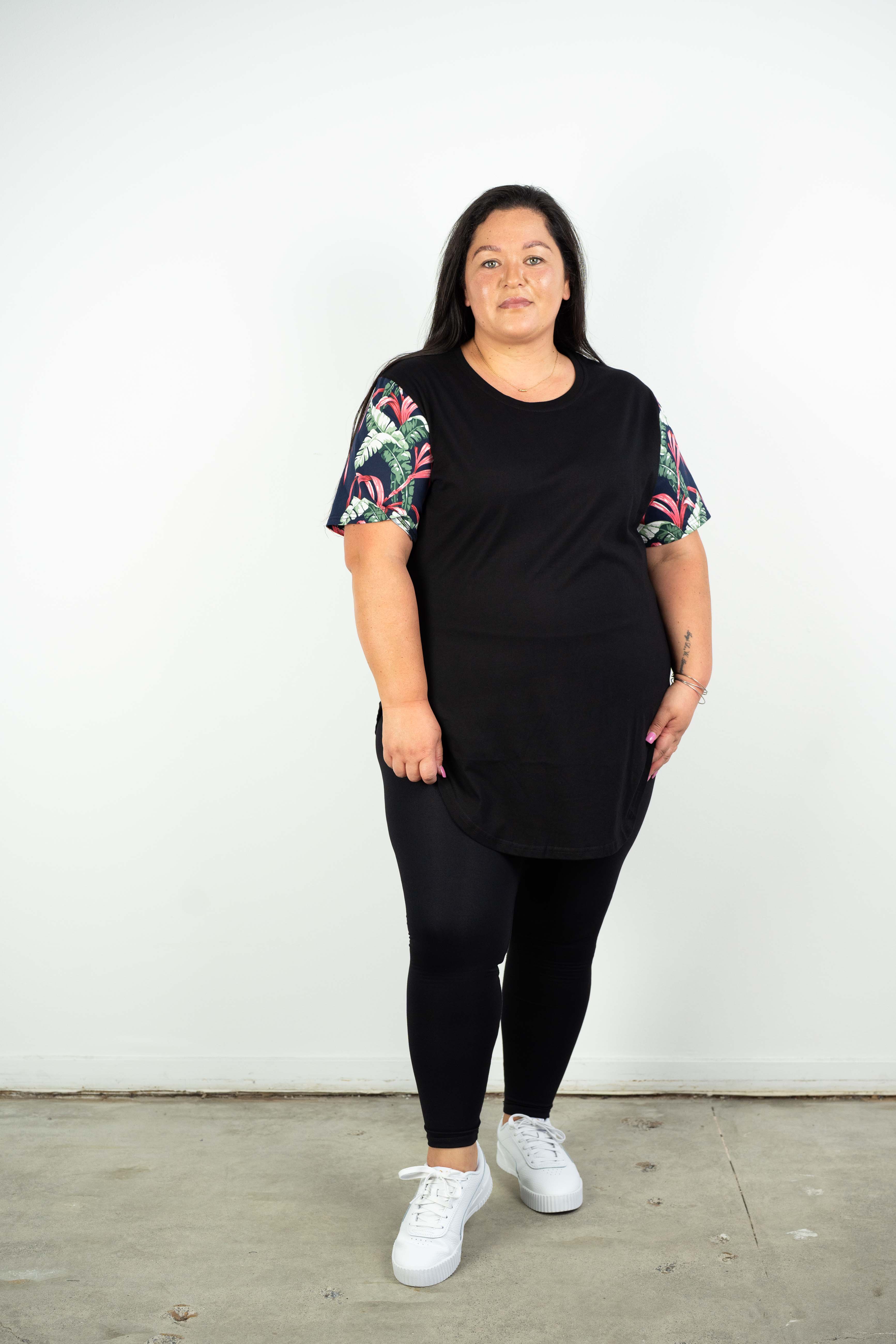 It features gorgeous printed sleeves with the print continuing on in a horizontal pattern at the back, and our classic tee shape with our famous rounded hi-low hem.